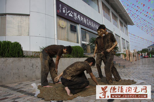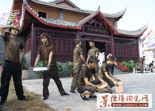 “銅雕”表演者在展示瓷器制作過程中的踩泥環(huán)節(jié)。踩泥俗稱練泥:將瓷胎的原料——高嶺土、瓷石經(jīng)過磨洗、除雜揉勻后調(diào)和成為用于制作瓷器的瓷泥。(江西網(wǎng)記者 何淳勇 攝)