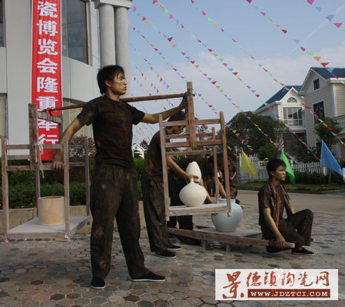 “銅雕”表演者在展示陶工在挑坯。做好的陶瓷坯模需要轉(zhuǎn)移風(fēng)干。(江西網(wǎng)記者 何淳勇 攝)