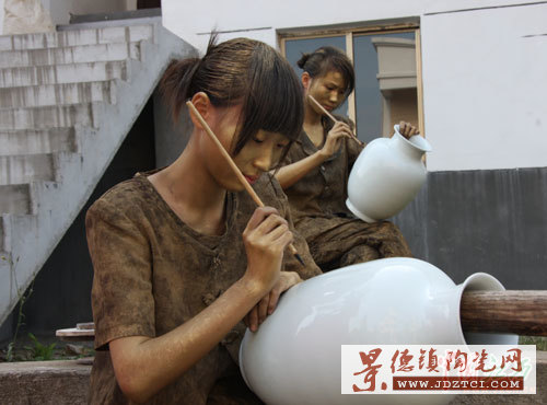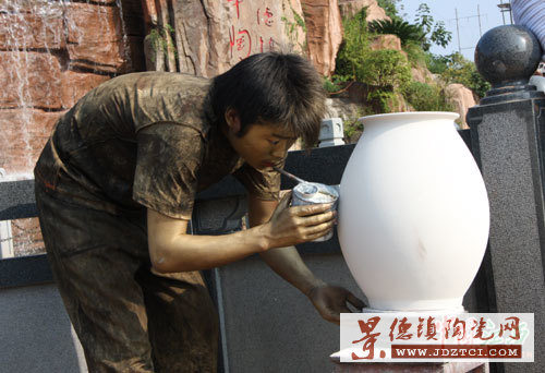 “銅雕”表演者在展示瓷器制作過程中的上釉環(huán)節(jié)。將顏料直接涂在未上釉的瓷胎上,再進(jìn)行上釉。由于顏料被包裹在釉之下,使得色彩能夠長(zhǎng)期保存,并不易被磨損。這種方式叫釉下彩。(江西網(wǎng)記者 何淳勇 攝)>