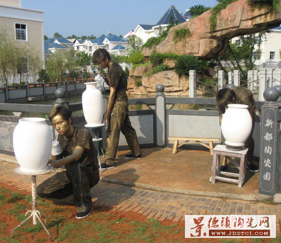 10月19日上午,在新都陶瓷園中華陶藝村內(nèi),摩肩接踵的參觀人群被一組組擺著各種poss的“銅雕”所吸引。這些“銅雕”人物完整地展示了制瓷工藝中的踩泥、吹釉、挑坯、滿窯、彩繪、拉坯等環(huán)節(jié)。