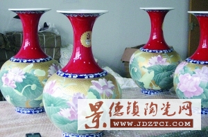 在公司的禮品陳列室,記者見(jiàn)到了這套驚艷四座的奧運(yùn)禮品瓷。兩款瓷品一樽為“花開(kāi)富貴瓶”,另一樽為“同心永連瓶”,高43.5厘米,直徑為27厘米,古典的“天球賞瓶”器型端莊典雅。前者瓶身以牡丹入畫(huà),雍容華貴,后者則以蓮花為主圖,清麗脫俗,駐足觀瞻,委實(shí)令人心醉其間。
