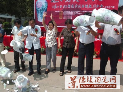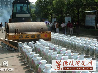 隨著儀式主持人的指令,數(shù)位參加儀式的嘉賓舉起每人手中的《盛世牡丹》瓶摔向地面。在脆如玉磬的裂響聲中,瓷瓶立時粉身碎骨,化作玉塵。緊接著壓路機開始大規(guī)模的銷毀行動,在全場人士眾目睽睽之下,近500只花瓶在短時間里就完成了玉碎成仁、魂歸大地的全過程。