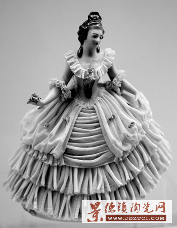 如今,歐洲瓷器與中國瓷器已經(jīng)長成完全不同的兩棵大樹了。中國歷史上的瓷器大多造型簡潔、用色單一,而歐洲瓷器造型寫實、色彩豐富,瓷器的用途也被擴(kuò)展到許多裝飾及實用物品上,包括照明、書寫工具和家具等。張嵐說:“這次展出了不少歐洲藝術(shù)瓷,在中國瓷器史上很少見!彼钢蛔霎a(chǎn)于德國德累斯頓的人物造型瓷說:“這個作品追求寫實的藝術(shù)風(fēng)格,人物身上的紗裙,是把絲織物放進(jìn)瓷土中燒制而成,遠(yuǎn)看和真的紗裙一樣,其實質(zhì)地是瓷器,這種工藝是當(dāng)時的中國所沒有的!