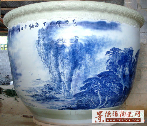 據(jù)悉,這只巨型陶瓷缸共用土十余噸,釉料60多斤。缸體為青花釉中、釉下彩,畫的是長(zhǎng)江三峽風(fēng)光,畫面氣勢(shì)宏大,缸沿上用影青釉和雕刻吉祥圖案,寓意富貴吉祥。另外,徐肆金還邀請(qǐng)了金陵畫家風(fēng)子、周一凡耗時(shí)一個(gè)多月繪制,并由畫家吳大千題跋。