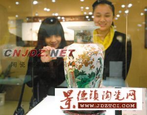 在該展展出的作品中,有很多是藝術(shù)家私人珍藏的精品,還有些是在拍賣行進(jìn)行競拍的作品。這些作品涵蓋了各種工藝,比如張松茂的粉彩山水,李進(jìn)的粉彩瓷板,陸如的青花瓷瓶等,傳統(tǒng)工藝與創(chuàng)新工藝同臺(tái)展示,爭相斗艷。該展的最大亮點(diǎn),可謂是中國工藝美術(shù)大師戴榮華帶來的兩件古彩作品,一件是2007年曾經(jīng)拍賣過的《紅葉傳情》,另一件是他去年創(chuàng)作的古彩精品《人面桃花相映紅》。這兩件作品色彩鮮艷,線條剛勁,構(gòu)圖圓滿,充滿了濃郁的中國民族藝術(shù)之美,十分引人注目。