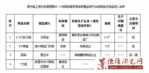 貴州省工商行政管理局近日發(fā)布2011年流通領(lǐng)域陶瓷餐具商品質(zhì)量監(jiān)測(cè)公告。根據(jù)公告,4批次商品抽查不合格。