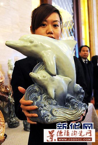 2月15日,一名工作人員在展示鄭商瓷材質(zhì)制作的2012年韓國(guó)世博會(huì)吉祥物“海豚寶寶”。