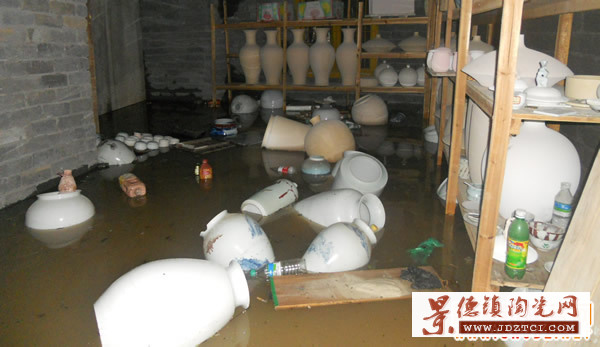 8月10日,臺(tái)風(fēng)“?苯o景德鎮(zhèn)帶來了一場強(qiáng)降雨,降雨引發(fā)的洪水更是造成了不小的損失。在這場洪水中,不少陶瓷商家都受到了影響。陶藝一條街、曙光路古玩市場因?yàn)榈貏葺^低,幾乎全部被淹,其間店鋪無一幸免。一些陶瓷手工小作坊,由于洪水的浸泡,不僅瓷坯化為了泥漿,就連窯爐等機(jī)器設(shè)備都受到了不同程度地?fù)p壞。