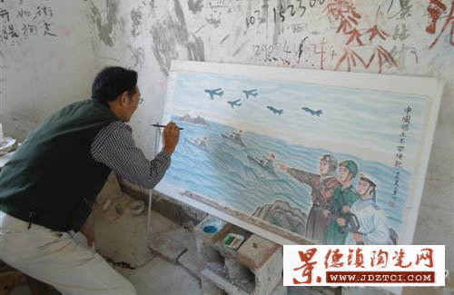 在這家瓷板畫作坊里,記者見到了創(chuàng)作者正在為這幅瓷板畫做最后的修飾,在藍(lán)天下五架戰(zhàn)斗機(jī)在向釣魚島方向飛去,在海面上三艘軍艦向釣魚島駛?cè),最突出的是海、陸、空三軍穿著整齊的軍服,手拿戰(zhàn)槍,共同保衛(wèi)著屬于中國的釣魚島,瓷板上寫著“中國領(lǐng)土不容侵犯”。