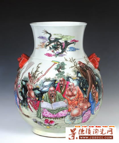 景德鎮(zhèn)陶瓷網(wǎng)訊:在珍藝堂所收藏的眾多廠瓷精品中,有這樣兩個(gè)瓷瓶尤為引人關(guān)注,它們分別為墨彩描金人物瓶和獸耳粉彩羅漢瓶。這兩件瓷器均創(chuàng)作于原藝術(shù)瓷廠,無(wú)論從制作工藝,還是從藝術(shù)水準(zhǔn)上來(lái)說(shuō),其都有著極高的收藏價(jià)值,是廠瓷中不可多得的精品。