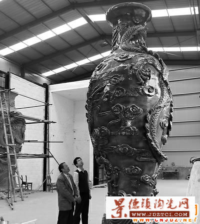景德鎮(zhèn)陶瓷網(wǎng)訊:高6.5米、最大直徑2.7米、重達(dá)7.8噸的世界最大巨型陶瓷九龍瓶在陶瓷名城山東省淄博市淄川區(qū)面世。據(jù)介紹,為了燒制最大園林陶瓷,中國陶瓷設(shè)計(jì)藝術(shù)大師、山東淄博辰浩雕塑藝術(shù)公司總經(jīng)理牛繼偉采用傳統(tǒng)制陶工藝,歷時(shí)16個(gè)月時(shí)間,消耗陶泥32噸,制作完成了世界最大巨型陶瓷九龍瓶,瓶身布滿了祥云,其間又穿插了9條形態(tài)各異的蛟龍,龍頭的浮雕高度達(dá)到0.3米。龍瓶的底座飾以水紋,象征財(cái)富。瓶,與“平”同音,寓意平安,九州同心,九九歸一。同時(shí),選擇淄博獨(dú)有的半無光釉——海水藍(lán)釉,經(jīng)過反復(fù)試驗(yàn),僅施釉就上了16遍,使整個(gè)瓶身通體油亮。經(jīng)過1280攝氏度高溫?zé)迫〉贸晒Α?/P>