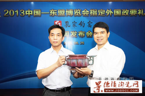 景德鎮(zhèn)陶瓷網(wǎng)訊 8月25日,第十屆中國—東盟博覽會(huì)國禮新聞發(fā)布會(huì)在南寧舉行。由中國工藝美術(shù)大師孔相卿設(shè)計(jì)制作的鈞瓷珍品《祥和尊》被選定為第十屆中國—東盟博覽會(huì)國禮,贈(zèng)送給東盟十國領(lǐng)導(dǎo)人。中國—東盟博覽會(huì)秘書處副秘書長黃平西出席新聞發(fā)布會(huì)并向國禮制作企業(yè)河南省孔家鈞窯總經(jīng)理孔春生頒發(fā)證書。