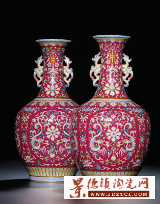 清乾隆 紫地粉彩龍紋夔耳瓶一對 以3504萬的高價成交