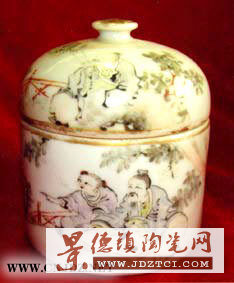 民國筒式套杯,高11厘米、圍23厘米,圓蓋桃鈕,套身繪青花粉彩山水圖,一側(cè)及蓋以行草書寫“可以清心”四字。彩頭、畫技均不佳,這種被稱為“笨拙粉彩” 是用一種劣料 的技法,民國時期景德鎮(zhèn)民窯多用于繪畫中下等瓷器。它與以上光緒兩品是無法媲美的,錄之供初入藏道朋友們參考而已。