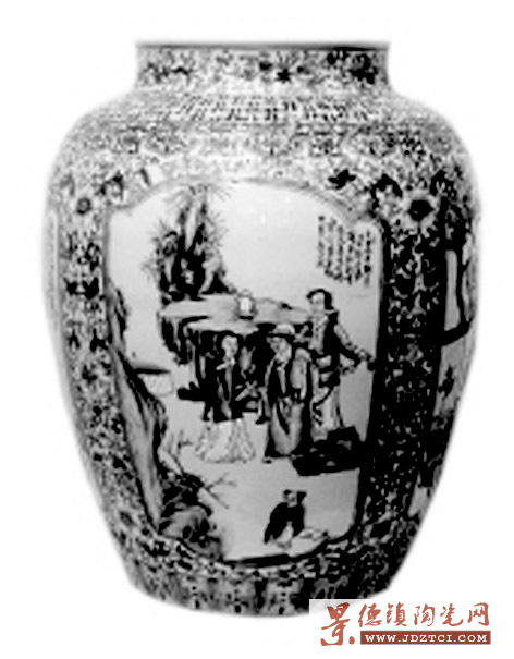 五彩瓷有兩種,一種是青花五彩,一種是純釉上五彩。青花五彩瓷是先在釉下用青花描畫出所繪圖案的藍(lán)彩部分,罩釉燒成,然后再在其余部分按圖案要求繪彩,再放入爐中進(jìn)行二次燒制,這樣一件青花五彩瓷器就算燒成了。這個(gè)壇子的繪畫和畫面以外的青花紋飾部分即是。嘉靖、萬(wàn)歷時(shí)期五彩瓷比較多見。嘉靖至明末清初,民窯開始大量生產(chǎn)五彩瓷器。民窯五彩青花作品的圖案一般說(shuō)來(lái)比官窯的要豐富,有神獸、花木奇石、人物山水等,生活氣息比較濃厚。其色彩主要是紅、綠、藍(lán)、黃,這四種顏色在這只瓷壇的畫面上搭配得恰到好處。