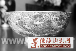 其中一件瓷器是乾隆海濤五龍碗。這只碗口徑為18厘米,足徑7.5厘米,高7.5厘米。碗的主圖為5條威猛矯健的龍紋。中間一條盤(pán)龍目光含兇,極其威嚴(yán)。在盤(pán)龍左側(cè)是條飛龍,直撲這顆龍珠,而右側(cè)是另一條龍騰空而起。在盤(pán)龍對(duì)面是一對(duì)龍?jiān)趹蛑椤_@5條龍都非常生動(dòng)。碗的底款是“乾隆年制”。