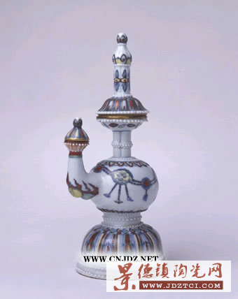 器形仿藏族銀制賁巴壺形式,造型略如塔,口、流均有蓋,新穎別致。壺直口,曲流,圓鼓腹,下承覆缽形托,圈足,足底沿外撇。通體以白色乳釘紋為界將紋飾分為不同的單元。用斗彩繪蓮瓣紋、如意云紋、火云紋等,腹部獸面瓔珞紋為主題圖案。
