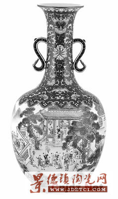 此件清乾隆粉彩春燈嬰戲雙耳瓶為乾隆粉彩的代表作品,無(wú)論從色彩、器形、工藝上都有很大的特點(diǎn),尤其在文化內(nèi)涵上更是反映了封建帝王希望“百子千孫”、“江山永固”的思想。同時(shí)也反映了千百年來(lái)勞動(dòng)人民盼望有子傳宗接代的良好愿望。此瓶細(xì)長(zhǎng)頸,撇口,耳作如意形,喻“平安如意”,碩腹,平底,矮圈足,口及耳描金,頸至肩及腹底以如意云頭為邊,在紅地上畫(huà)纏枝番蓮間飾蝙蝠。腹部彩繪高山流水,庭舍樓臺(tái),配以樹(shù)石花草,眾嬰孩嬉戲其間,或舞龍或提燈,足邊描回紋,器內(nèi)及底均施湖綠色釉,底描紅書(shū)“大清乾隆年制”六字篆款。
