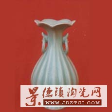 北宋梅子青釉無(wú)紋汝瓷雙環(huán)瓜楞花口瓶