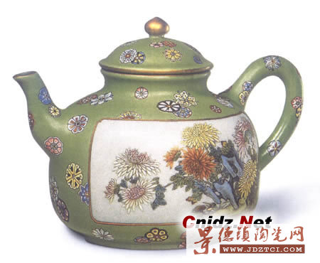 > 粉彩綠地開光菊花紋茶壺