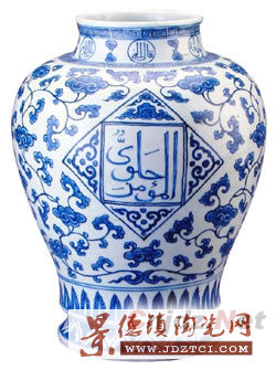 此罐有一種特殊的裝飾,即開光中的阿拉伯文。瓷器的燒造有時跟皇帝的喜好有關(guān)系,正德皇帝崇信伊斯蘭教,因而這個時期的瓷器上很多裝飾有阿拉伯文。