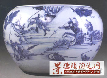 口沿內(nèi)斂,肩以下漸收,圈足,器形沉穩(wěn),圈足沙底。通體繪青花刀馬人物故事圖,青花發(fā)色淡雅,周圍繞有山石、柳樹、祥云,構(gòu)圖豐滿,層次清晰,人物繪畫惟妙惟肖,生動傳神,畫工流暢。