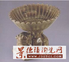 這件金代青釉獅形燈盞高9.5厘米,口徑10.5厘米,底徑7*5厘米。燈座為臥獅狀,獅子張嘴露齒,回首左視,耳、鼻、須、眼等刻印清晰;獅四肢前屈,尾上翹,臥在長方形底座上,形象頗為生動。獅背上置一圓形盞,盞為菊瓣形口,有30余瓣,盞內(nèi)印花,盞心為折枝牡丹紋,盞壁模印蓮瓣紋。燈盞通體施青釉,釉色姜黃,有開片,釉薄處顯胎筋,胎色灰白。底足無釉,有一孔。一盞之內(nèi)以菊、蓮、牡丹三種花卉裝飾,很是難得。