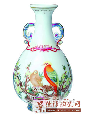 這件清乾隆御制琺瑯彩題詩花石錦雞圖雙耳瓶是這次高仿國寶級文物最耀眼的一件,它曾是乾隆皇帝的賞玩之物。此件物品正是乾隆時(shí)期的代表作品,造型小巧秀麗,頸部飾以卷草形雙耳,垂肩處的如意紋飾雅致婉麗。瓶身主題圖案為“花石錦雞”,寓意錦上添花。錦雞棲立于樹干之上,側(cè)旁以粉紅花卉、玲瓏洞石相襯,“新枝含淺綠,曉萼散輕紅”,二句題詩與畫面相得益彰。整個(gè)畫面布局勻稱,淡雅細(xì)膩,色彩相互層疊,富麗多姿,堪稱難得一見的佳作。