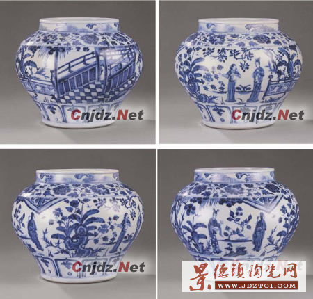 元青花“鬼谷子下山圖”罐,故事來自于元代版畫《樂毅圖齊七國(guó)春秋后集》,它表現(xiàn)了戰(zhàn)國(guó)時(shí)代齊、燕交戰(zhàn)中,孫臏被燕國(guó)囚禁,他的師傅鬼谷子下山營(yíng)救徒弟的故事。同樣的一件元青花“錦香亭圖”罐,2005年在香港佳士得也拍出了4900萬(wàn)人民幣的高價(jià)。該罐上所繪場(chǎng)景出自元代著名劇作家王仲文雜劇《孟月梅寫恨錦香亭》,表現(xiàn)了唐玄宗時(shí)期才子佳人陳圭與孟月梅曲折的愛情故事,此兩罐是稀世珍品——元朝人物故事青花罐八件中的兩件。兩罐繪畫中的主題人物故事雖不一樣,但器物的高度、直徑等卻大致相同。頸部、肩部也都分別繪上了相似紋飾。只可惜“錦香亭圖”罐的罐口有了修補(bǔ),其價(jià)值便大大低于“鬼谷子下山圖”。元青花瓷器的裝飾紋飾大多為牡丹、竹梅,龍紋、蓮紋、花鳥等,因此,青花瓷器上歷史人物故事的出現(xiàn),就顯得更為珍貴。