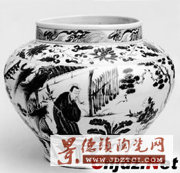 元青花瓷人物題材的作品歷來稀少,據(jù)目前不完全統(tǒng)計,國內(nèi)外僅10余件館藏品,且無一不具有極高的藝術價值。人物題材瓷器的出現(xiàn)和元代戲曲小說與版畫的發(fā)達有著密切的聯(lián)系。當時雜劇、戲劇、歷史故事盛行,景德鎮(zhèn)的工匠將其中有關情節(jié)繪在瓷器上,頗有意趣,從而顯現(xiàn)了一種新的藝術境界。罐的器形正適用于描繪敘事性圖案,因此常繪有元曲或通俗故事。這件元青花大罐上所繪的圖案別具一格,值得一書。
