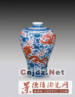 乾隆時期青花釉里紅的龍紋圖案就大不相同了。這時的海水云龍紋、海水紋依然安排在瓶底,但沒有了雍正時期精工描繪的紅釉巨龍穿行于云間,云氣大量遮蓋身體的特點,這是乾隆與雍正時期海水云龍紋的最大區(qū)別。乾隆時的青花釉里紅特點是:青花色澤濃艷,釉里紅較淡雅,紅色中常見綠色苔點,紋飾所繪青葉紅花已經(jīng)逼真于寫實。