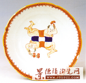 廣州博物館收藏了一件清代乾隆時期的廣彩四喜圖花口碟(如圖)。它高3.2厘米,口徑14.3厘米,足徑7.6厘米,是一件十分獨特有趣的廣彩瓷碟。這件白底的瓷碟有一圈黃色的邊線,沿口則有一圈較寬的紅色的碎花圖案。有趣的是,瓷碟的中央有一個由四個娃娃組成的圖案,兩個穿著紅肚兜和兩個穿著藍肚兜的娃娃光著屁股,頭上一邊扎著一個小髻,手里舉著花兒。這四個娃娃只有兩個頭和兩個屁股,但卻有四個身子;兩個娃娃共著一個頭和一個屁股,但各有各的身子,他們組成了四個娃娃,形成了一個頗似雙“喜”字的圖案。娃娃們胖乎乎的,是傳統(tǒng)的中國造型,十分可愛,很有喜慶色彩。