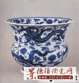 正德皇帝荒于政事,明朝國力從此由盛轉(zhuǎn)衰,青花瓷器也隨之由頂峰轉(zhuǎn)向下坡。青花料除用平等青、石子青外,后期開始使用“價(jià)倍黃金”的回青。正德瓷器的繪畫手法非常精練,細(xì)描勻染,圖案生動(dòng)精致。2004年4月香港蘇富比拍的一件正德青花穿花龍紋盤,直徑19.5厘米,成交價(jià)118萬港幣。穿花龍紋的使用,在正德時(shí)期非常盛行。所繪龍紋穿行于纏枝花中,纏枝花紋勾邊不留白,布局飽滿。這種畫法成為正德時(shí)期一種獨(dú)特的紋飾風(fēng)格。