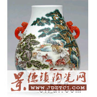 乾隆時(shí)期的粉彩綜合了康熙與雍正兩朝的制瓷工藝,乾隆帝對(duì)有些粉彩器物的用途、形體、花紋的要求常有御旨。此尊為乾隆皇帝壽誕時(shí)所燒制,高45厘米,口徑16厘米,足徑24.2厘米。尊敞口,口以下漸廣,垂腹,圈足。肩部?jī)蓚?cè)各有一螭耳。尊體繪百鹿,襯以山林、小溪、靈芝、花草等景物。蒼松翠柏下群鹿或奔跑,或相偎,或憩息,形態(tài)各異。經(jīng)專家們認(rèn)真研究瓷藝大師反復(fù)實(shí)踐,終于再現(xiàn)了這一器物的神韻。