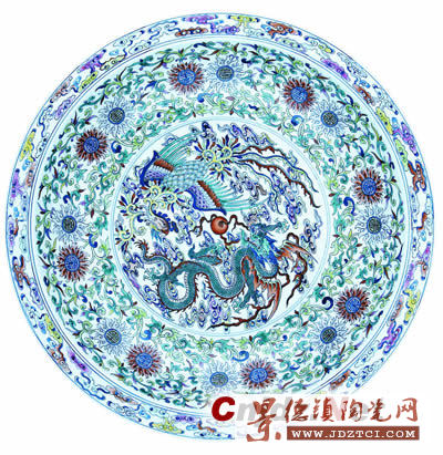 清朝盛世的斗彩瓷器失去了成彩清秀飄逸的風采。唯有此盤雖尺寸較大,但形體規(guī)整,盤心所繪龍鳳戲珠紋寓意“龍鳳呈祥”,外壁紋飾寓意“壽山福!边存有成彩遺風,極具藝術審美價值。