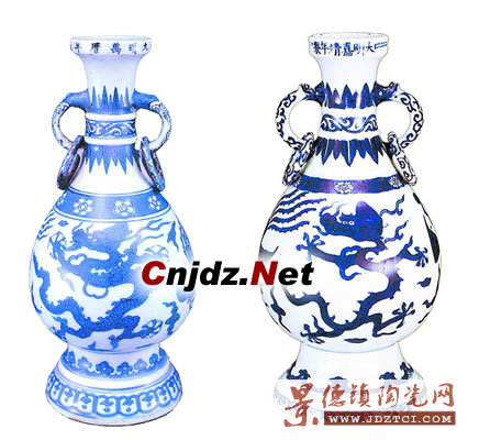 青花瓷器從明初以來(lái)一直是景德鎮(zhèn)生產(chǎn)的主流,到萬(wàn)歷時(shí)期產(chǎn)量大大增加。“青花雙耳活環(huán)瓶”是明代嘉靖、萬(wàn)歷時(shí)期的典型器物。