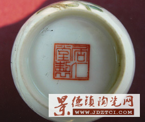 粉彩花鳥(niǎo)瓶(圖1、圖2)長(zhǎng)頸、敞口、薄唇、溜圓肩、直弧腹、圈平底、內(nèi)圈足。瓶身略呈橄欖形。頸腹之間有兩處殘缺,外底部以紅彩銘“居仁堂制”四字篆書(shū)款,外加紅色邊框。銘文的筆道規(guī)整,線條爽利,紅彩色澤鮮艷。瓶通高14.3厘米,腹徑6.8厘米、口徑3.6厘米,底徑3.4厘米?芍潴w形極為輕巧。胎質(zhì)潔白細(xì)膩,其突出特點(diǎn)是:胎體極薄,最薄處不足1毫米,最厚處不足1.5毫米。手感特別輕巧,加上其體形較小,剛好以手一握,便于把玩。可謂小巧玲瓏,精致可愛(ài)。