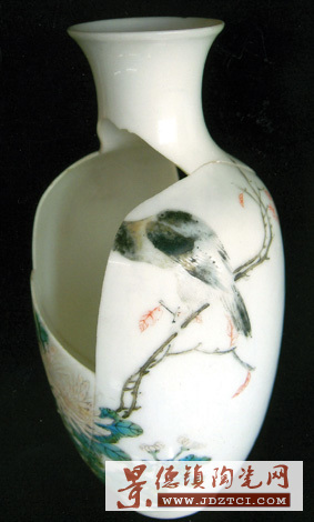 釉面潔白光亮,釉層特別薄,與胎體結(jié)合天衣無(wú)縫,可見(jiàn)其各方面品質(zhì)俱佳。瓶身以粉彩繪有花鳥(niǎo)圖案,花為黃色菊花,黃色較淺淡,葉子的深綠色為孔雀綠,淺者為草綠色,其色澤鮮艷奪目。