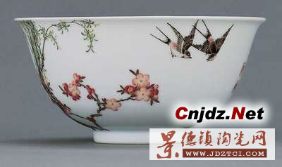 2006年11月,著名收藏家張宗憲先生收藏的清乾隆御制琺瑯彩杏林春燕圖碗,在香港由佳士德拍賣公司拍賣,約以1.51億港元成交。此碗琺瑯彩繪杏林春燕圖,弱柳扶風(fēng),杏花盛開,雙燕飛翔其間,一側(cè)行楷御題詩:“玉剪穿花過,霓裳帶月歸”。造型秀美,白釉溫潤,底為雙方框“乾隆年制”藍料款。工藝精湛,為乾隆琺瑯彩杰作。1985年5月此碗曾在香港蘇富比上拍,成交價為110萬港幣,短短二十年的時間,價格就翻了130多倍。