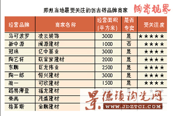 目前進(jìn)駐鄭州市場(chǎng)的仿古磚品牌主要有馬可波羅、羅馬利奧、金意陶、樓蘭、陶藝軒、瑪拉茲等近50個(gè)。今年剛進(jìn)入鄭州的仿古磚品牌主要有瑪拉茲、丹力士、華鴻和哈伊馬角等近十家。鄭州經(jīng)營(yíng)仿古磚的商戶多為實(shí)力商戶。