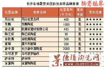 最近幾年湖南地區(qū)刮起了仿古風(fēng),消費(fèi)者對(duì)仿古磚品牌的熱度有增無(wú)減。雖然商家普遍看好仿古磚的發(fā)展前景,但長(zhǎng)沙仿古磚銷量仍下降了5%左右,常德、郴州等二、三級(jí)市場(chǎng)銷量降幅在15%左右。長(zhǎng)沙地區(qū)建陶共400家,專賣和兼營(yíng)仿古磚的商家有70家,占建陶商家的17.5%,這一比例在地市級(jí)市場(chǎng)則更高。目前長(zhǎng)沙仿古磚的專賣商家有32家,主要品牌包括:瑪拉茲、金意陶、羅馬利奧、樓蘭、陶藝軒、雅士·高夫。長(zhǎng)沙仿古磚品牌眾多,可選性強(qiáng),競(jìng)爭(zhēng)也較為激烈。