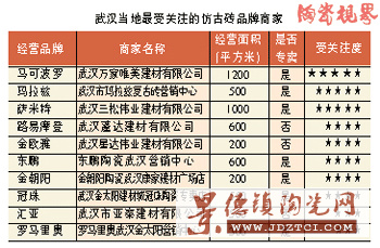武漢市場(chǎng)上經(jīng)營(yíng)仿古磚的商家占到了所有建陶商家的60%以上,但真正有實(shí)力的仿古磚商家并不多,甚至還有很多商戶一直靠“炒貨”生存。不過(guò),像馬可波羅、瑪拉茲、金意陶等以仿古磚經(jīng)營(yíng)為主的專賣店,在武漢市場(chǎng)上還是比較受歡迎的。但由于雜牌、低檔次仿古磚對(duì)市場(chǎng)有一定的沖擊作用,消費(fèi)者廣泛接受仿古磚還需時(shí)日。