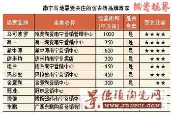 目前,南寧消費(fèi)者開(kāi)始逐步接受仿古磚。據(jù)抽樣調(diào)查數(shù)據(jù)顯示,南寧仿古磚銷量基本與去年持平,二、三級(jí)市場(chǎng)上升幅度在10%左右。仿古磚尤其被80后年輕人所青睞和追捧,作為年輕人裝修的首選產(chǎn)品,仿古磚的市場(chǎng)需求也越來(lái)越大。在市場(chǎng)內(nèi)需的拉動(dòng)下,目前南寧經(jīng)營(yíng)仿古磚經(jīng)銷商已有30多家。主要品牌有:瑪拉茲、金意陶、馬可波羅、簡(jiǎn)一、羅馬利奧 、樓蘭、陶藝軒、圣·凡爾賽、上元山河、薩米特、奧米茄、榮高、金朝陽(yáng)、新里萬(wàn)、陶一郎、歐盟尼魔方磚、馬可新地、冠珠、宏宇、嘉俊等20多個(gè),品牌集中化程度逐步提高。