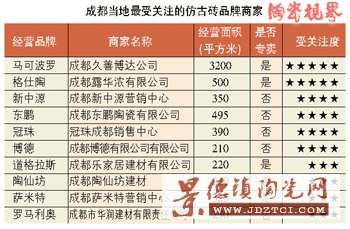 成都經(jīng)營仿古磚的商家大概有200多家,約占總陶瓷經(jīng)銷的80%,專賣仿古磚的商家很少,大多是多品類經(jīng)營的。以專賣店經(jīng)營的主要有:道格拉斯、瑪拉茲等。