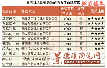 重慶陶瓷市場的仿古磚品牌有馬可波羅、東鵬、冠珠、新中源、瑪拉茲、金意陶、騰達(dá)、陶藝軒、博德、羅馬利奧、樓蘭、賽德斯邦、圣·凡爾賽、薩米特、奧米加 金歐雅、簡一、金朝陽、陶一郎、圣陶坊、大唐合盛、宏宇、匯亞、嘉駿、冠軍、P·K、能強(qiáng)、帝舵、鉆石、建輝等。
