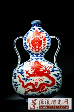 清乾隆青花海水紅彩龍紋八吉祥如意耳葫蘆扁瓶