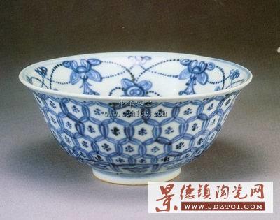 侈口,深腹,圈足,釉色青白,青料呈色鮮艷,略見鐵結(jié)晶斑。外壁滿繪互聯(lián)的錢紋,脛部為一周變形蓮瓣紋,內(nèi)壁飾花瓣,古錢和瓔珞組合圖案一周,碗心為以錢紋為花心,外圍七個變形蓮瓣組合的團花紋。此碗為