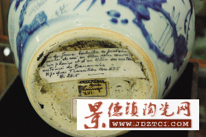 據(jù)陳經(jīng)理介紹,該瓷罐是在一次海外回流物品展賣會(huì)上購(gòu)得的。作為海外回流的物件,其收藏價(jià)值較高。我們?cè)诠拮拥撞堪l(fā)現(xiàn)貼有標(biāo)簽,上面寫有精美外文,看起來(lái)已有些年頭。其上唯一的數(shù)字即1635,此時(shí)正值明崇禎八年。據(jù)介紹,這是一位國(guó)外收藏家粘貼上的標(biāo)識(shí),這與其海外回流的身份不謀而合。