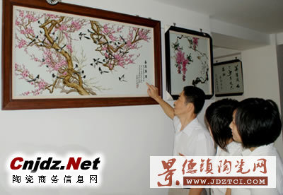 林正茂在江西省景德鎮(zhèn)市藝術(shù)交流中心向大家介紹粉彩瓷板畫《喜迎奧運》。