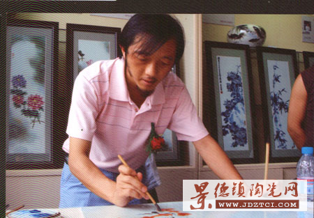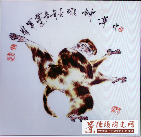 對這次獲獎,他并不特別在意,對自己的陶瓷技藝十分自信。何況,這次獲獎作品,還并不是他平時最喜愛、最擅長、也在陶瓷界最有影響的作品類型。這位年輕的國家級高級工藝美術(shù)師、江西省首屆陶瓷美術(shù)家,從事陶瓷美術(shù)30年,早在1982年的第一屆陶瓷“百花獎”中,就以釉下五彩人物花瓶和皮燈分獲二、三等獎;作品曾先后榮獲國內(nèi)外陶瓷大獎數(shù)十項(xiàng)。其中瓷板畫《壽猴》和瓷板畫《游春圖》分別在1991年和1993年的“日本恩巴——景德鎮(zhèn)陶瓷藝術(shù)精品展中獲“入賞”和優(yōu)秀作品獎,作品被日本的中國近代美術(shù)館珍藏,并因此而被日方邀赴日本,表演獻(xiàn)藝。2005年參加“首屆中國高級工藝美術(shù)師提名展”榮獲“中國工藝美術(shù)學(xué)術(shù)獎”,歷年來還為釣魚臺國賓館和國家駐外機(jī)構(gòu)以及國家領(lǐng)導(dǎo)人出訪禮品瓷創(chuàng)作設(shè)計(jì)了多件、套優(yōu)秀的日用陶瓷,1992年設(shè)計(jì)的《十四碩果圖》煙茶具,被選為黨的十四大主席團(tuán)專用瓷,1993年圖盤《猴趣》被國家領(lǐng)導(dǎo)人出訪時,作為禮品瓷送給外國元首。此后,萬志軍就獲得業(yè)界的“猴王”譽(yù)稱。